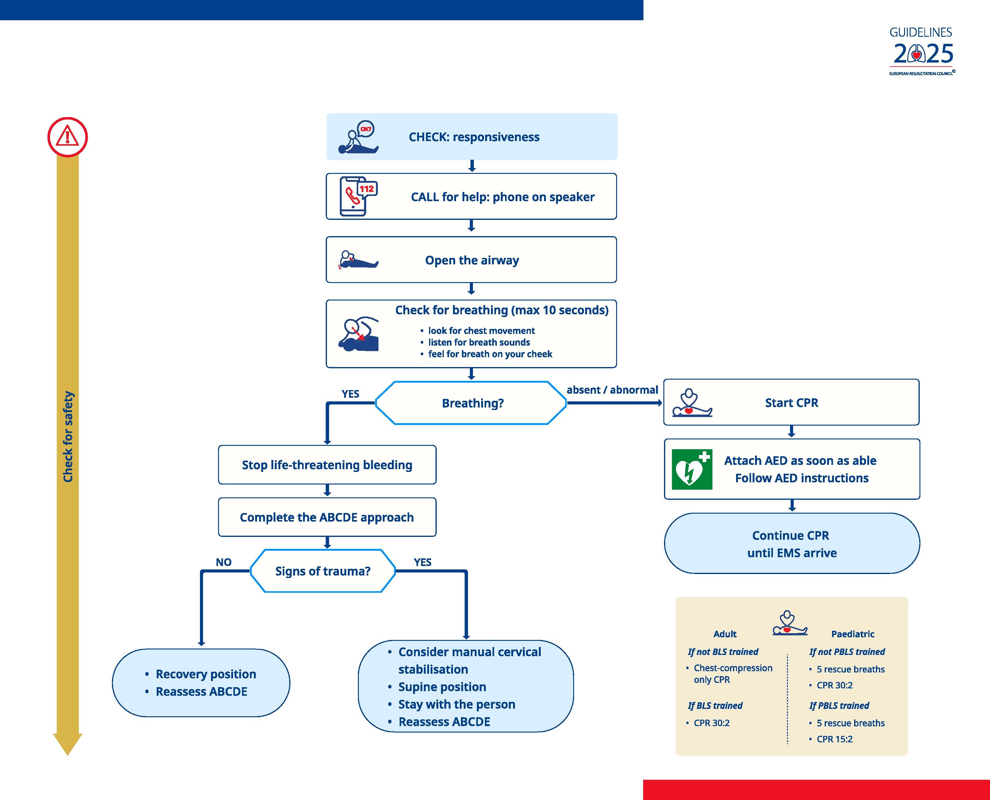 Zde je vizualizace základního postupu pro laickou resuscitaci (Basic Life Support) dle nejnovějších doporučení Evropské resuscitační rady pro rok 2025.
